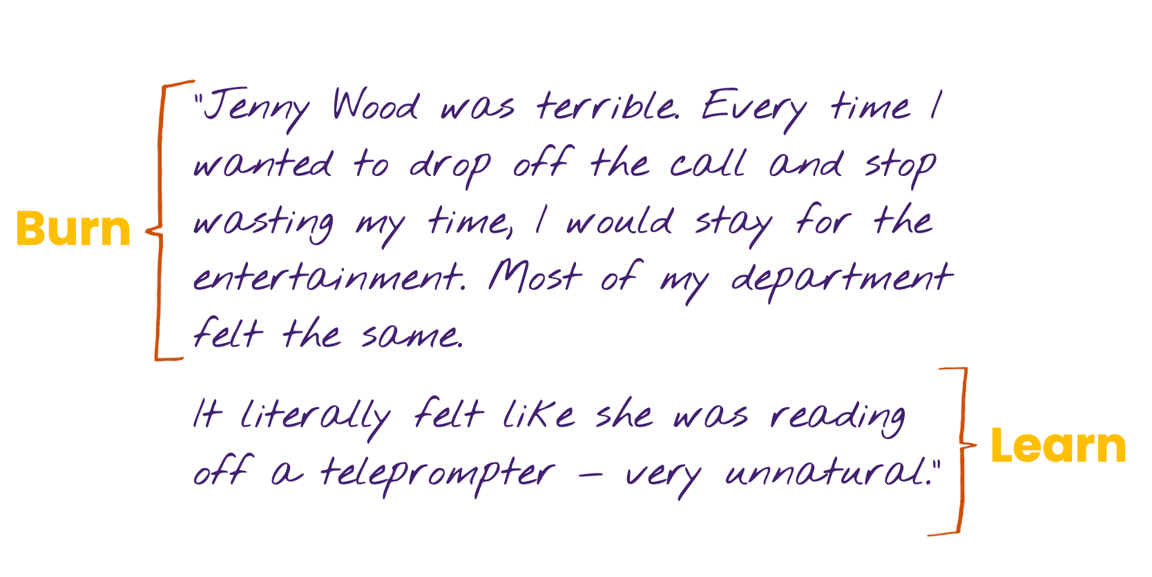 “Jenny Wood was terrible. Every time I wanted to drop off the call and stop wasting my time, I would stay for the entertainment. Most of my department felt the same. It literally felt like she was reading off a teleprompter — very unnatural.”
